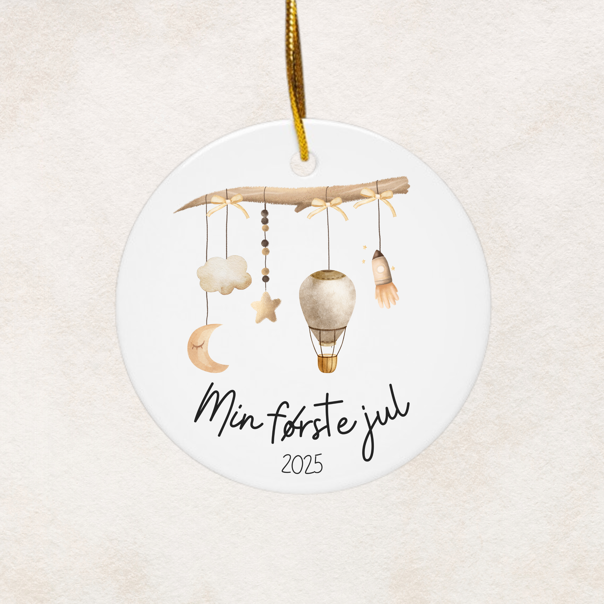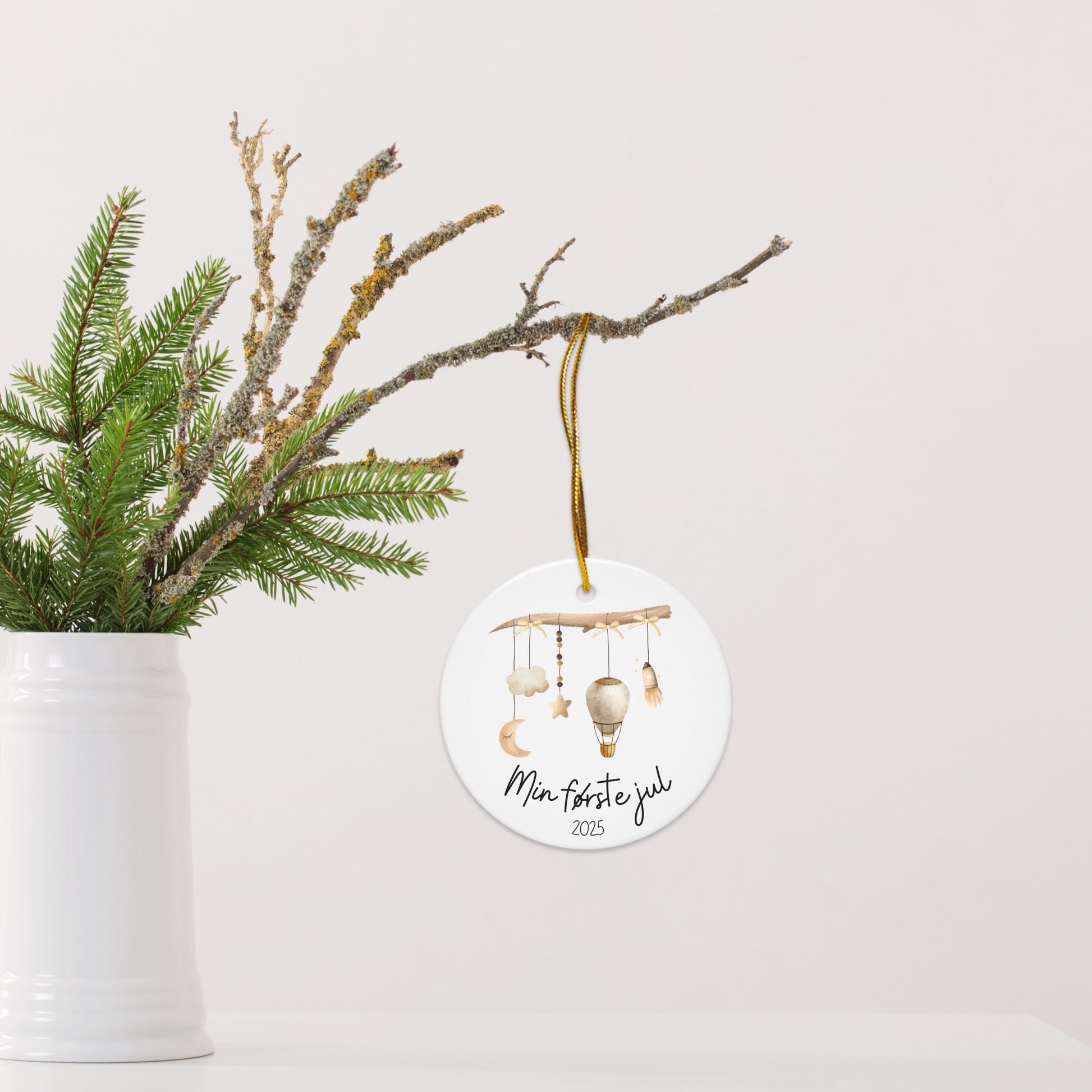 Vakker juletrepynt i keramikk med glansfull overflate – et varig minne fra den aller første julen. Trykk på en side, gullfarget tråd til oppheng. Med årstall 2025.